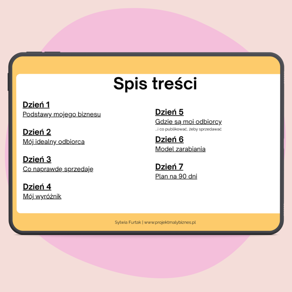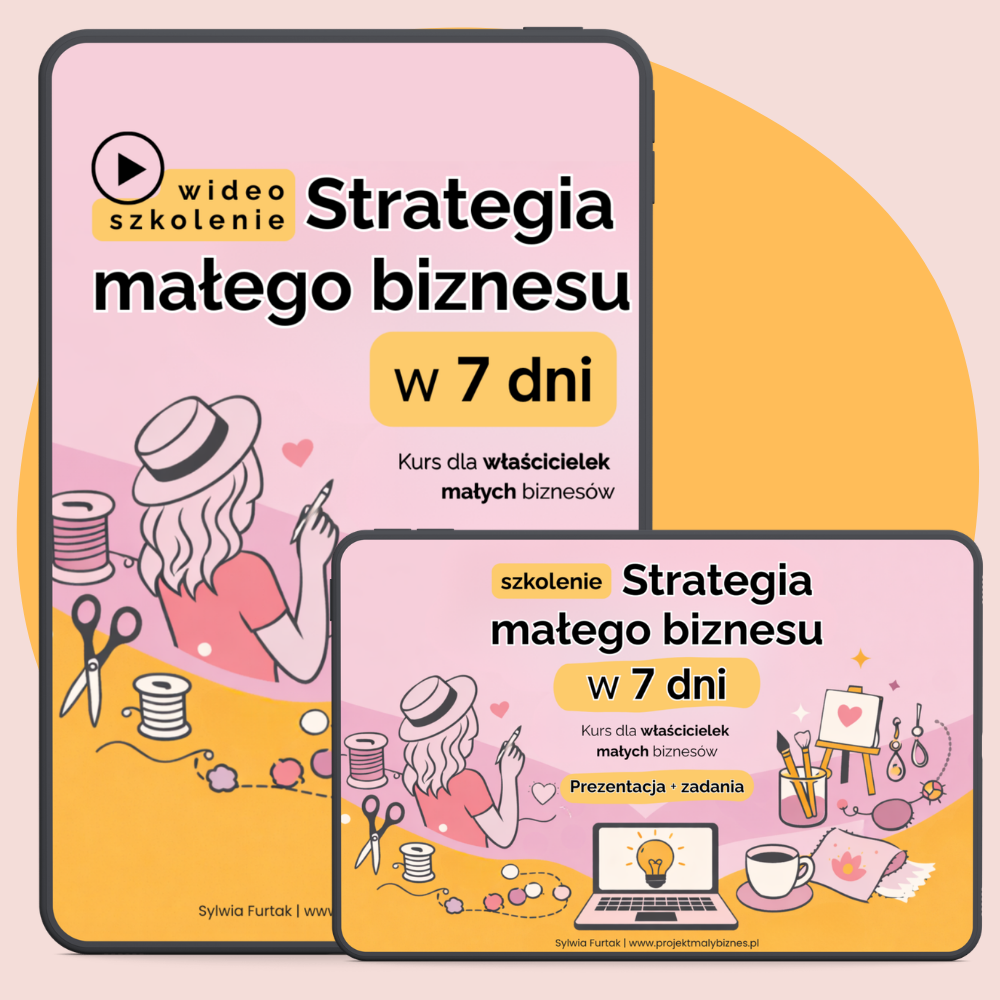 Stwórz strategię małego biznesu w 7 dni to praktyczne szkolenie online (wideo + prezentacja z ćwiczeniami) dla kobiet prowadzących kreatywne biznesy, takie jak rękodzieło, biżuteria, ilustracje czy produkty cyfrowe. W szkoleniu krok po kroku stworzysz własną strategię biznesową, określisz swoją idealną klientkę, wyróżnik marki oraz nauczysz się, jak sprzedawać produkty poprzez emocje i spójną komunikację. Szkolenie zawiera ćwiczenia oraz gotowe narzędzia, które pomogą Ci uporządkować działania, zwiększyć sprzedaż i rozwijać markę w sposób świadomy i autentyczny.